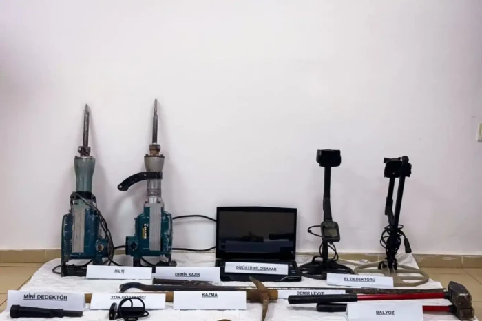 kazı " class="text-dark font-weight-bold" target="_blank">Kaçak kazı yapılan bölgede 3 dedektör, yön gösterici cihaz, dizüstü bilgisayar, kazma, kürek ve demir aparat ele geçirildi.