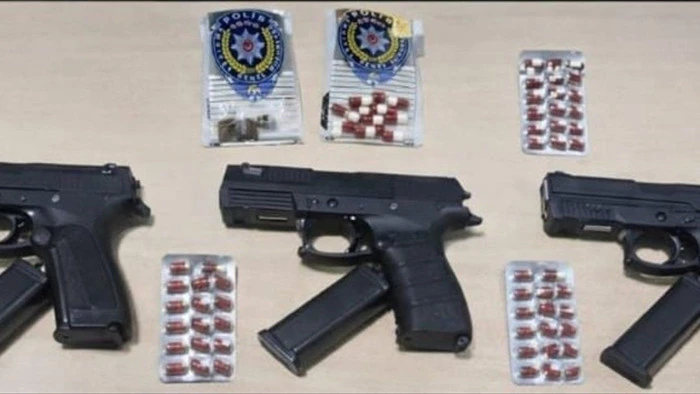 Şüphelilerin ikametlerinde yapılan aramalarda 3 ruhsatsız tabanca ile çok sayıda uyuşturucu hap ele geçirildi.