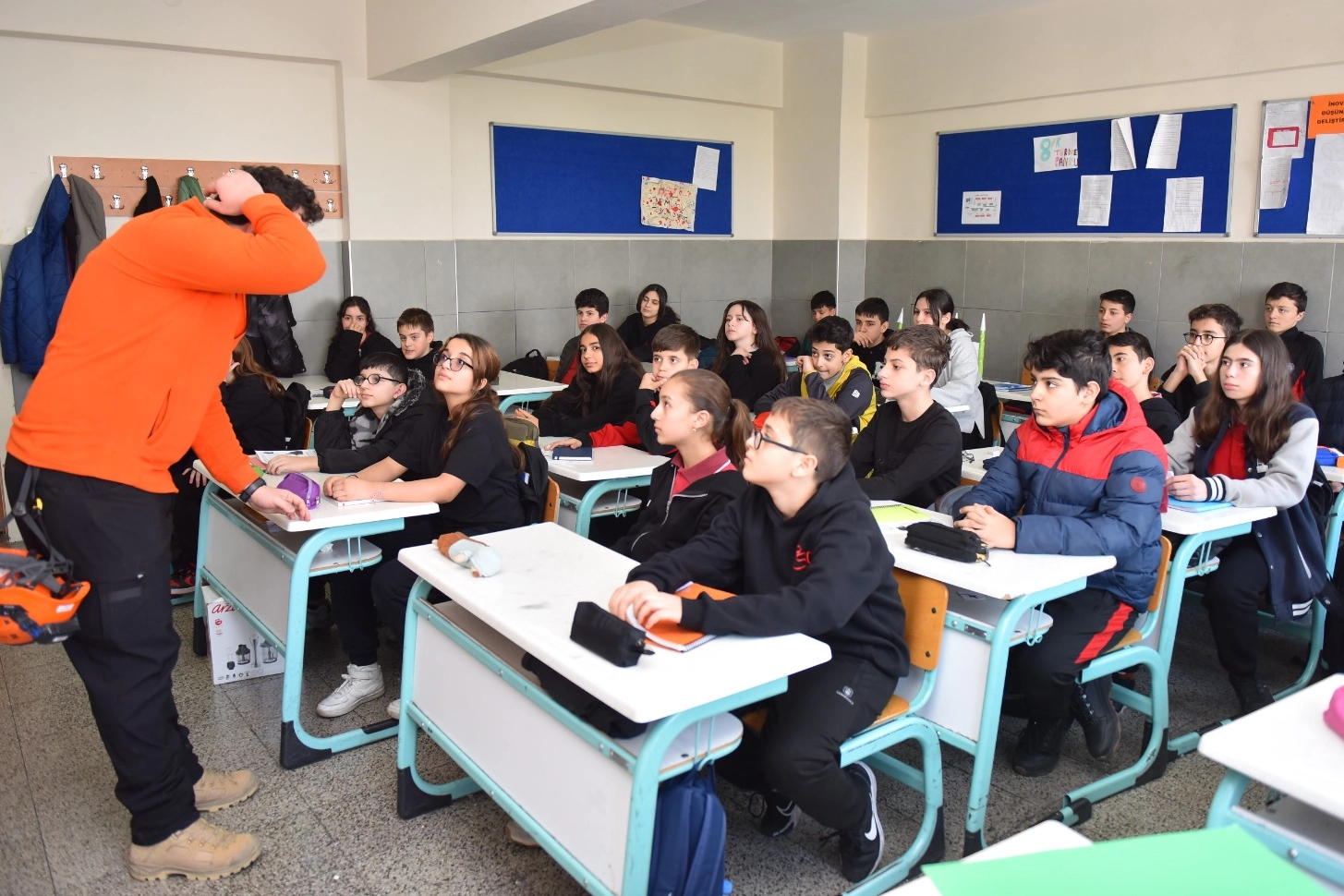 Bursa Yıldırım Belediyesi Afet İşleri Müdürlüğü Ekipleri, Peyami Safa Ortaokulu Öğrenci ve öğretmenlerine deprem farkındalık eğitimi ve tatbikatı düzenledi.