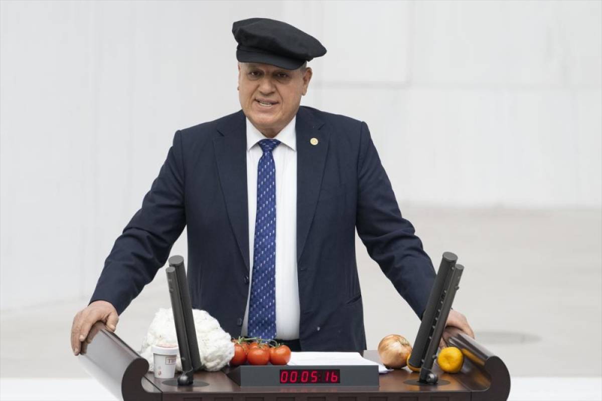CHP Adana Milletvekili Ayhan Barut, konuşması sırasında, kürsüye domates, soğan, mandalina ve pamuk bıraktı, kasket taktı.