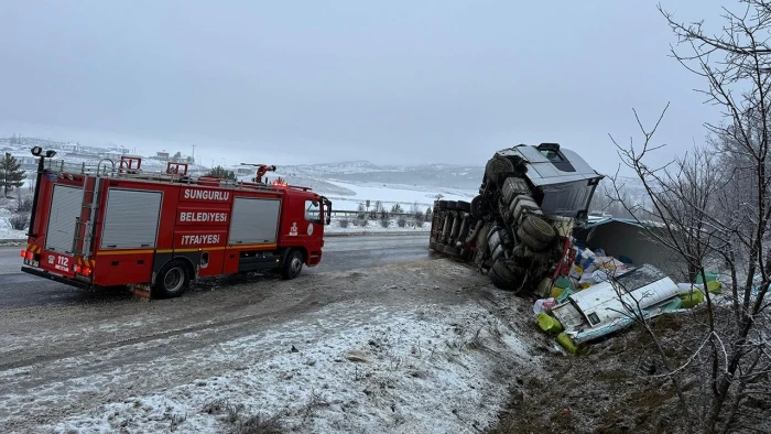 ÇORUM (AA) - Çorum'un Sungurlu ilçesinde devrilen tırın sürücüsü yaralandı.