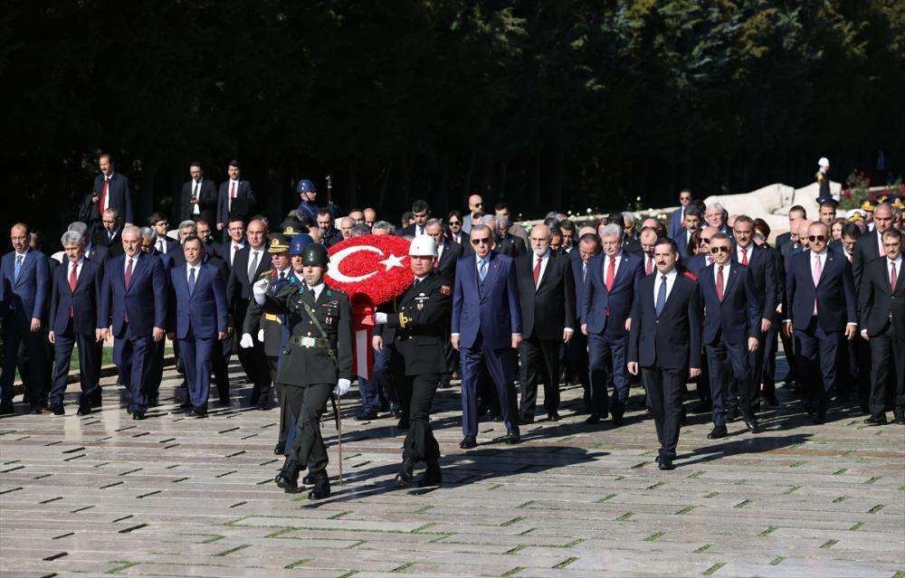 Cumhurbaşkanı Erdoğan'ın üzerinde ay yıldız bulunan çelengi Atatürk'ün mozolesine bırakmasının ardından saygı duruşunda bulunuldu ve İstiklal Marşı okundu. Daha sonra Erdoğan ve beraberindekiler, Misak-ı Milli Kulesi'ne geçti. Cumhurbaşkanı Erdoğan, burada Anıtkabir Özel Defteri'ne şunları yazdı:
