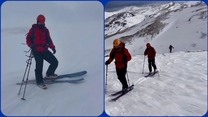 Yaklaşık 2,5 saat süren zorlu tırmanışla zirveye ulaşan sporseverler, karla kaplı sarp yamaçlar ve yüksek eğimli yerlerden kayak yaparak iniş yaptı.