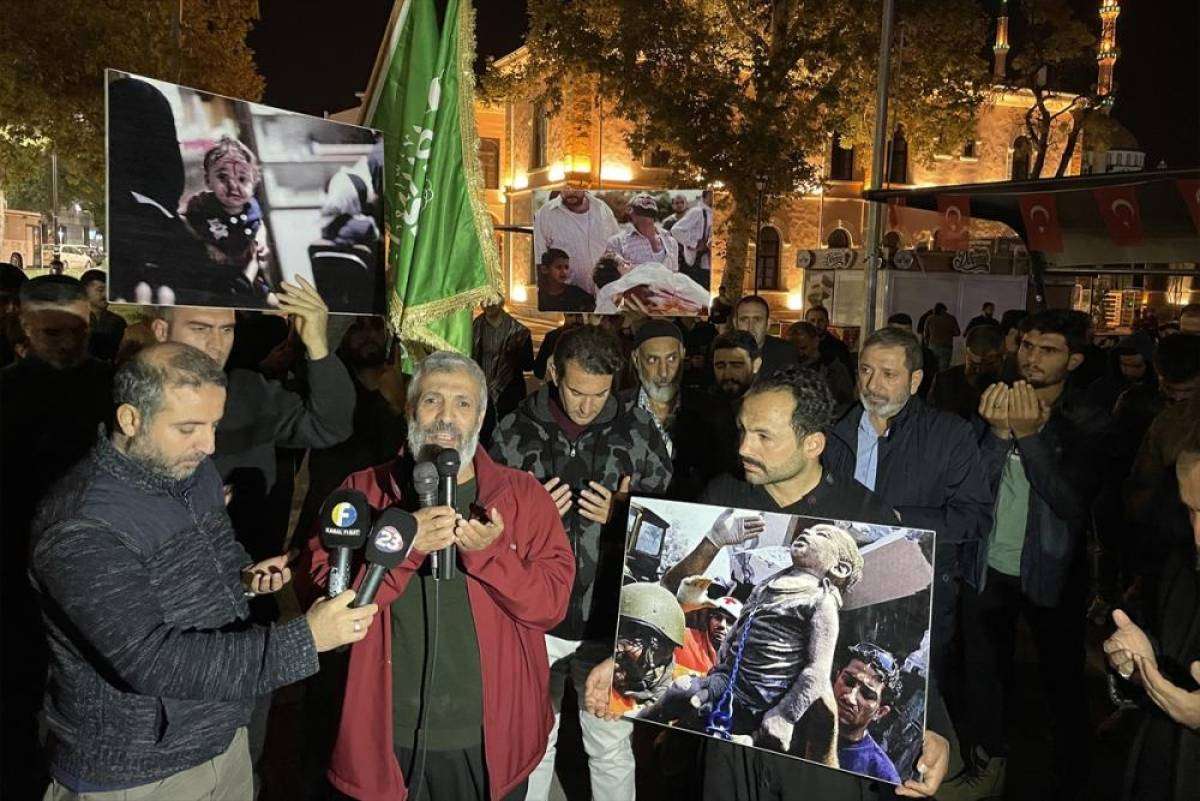 Hastanenin bombalanmasına tepki gösteren katılımcılar, "Katil İsrail Filistin'den defol" sloganı atarken, sık sık tekbir getirdi.