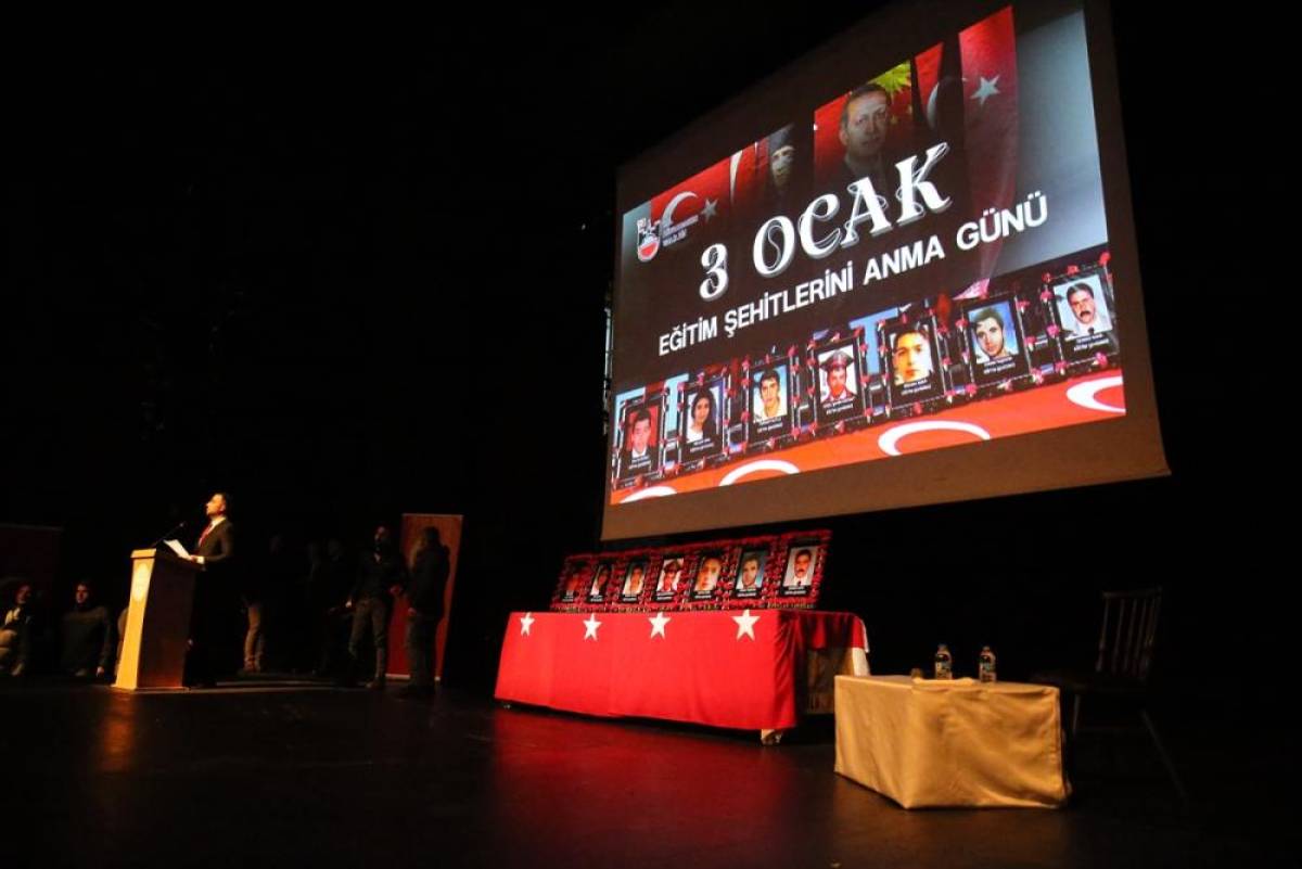Kültür merkezindeki sahnede Türk bayrağı ile saldırıda yaşamını yitirenlerin karanfillerle süslenen fotoğrafları da yer aldı.