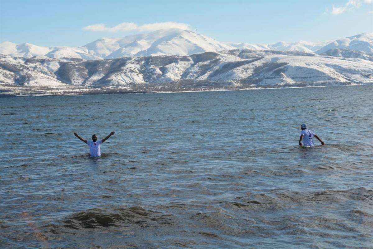 BİTLİS (AA) - Vangölü Aktivistleri Derneği üyesi 3 doğasever, Van Gölü'nün korunmasına katkı sağlamak ve kış turizmine dikkati çekmek amacıyla dondurucu soğukta gölde yüzdü.