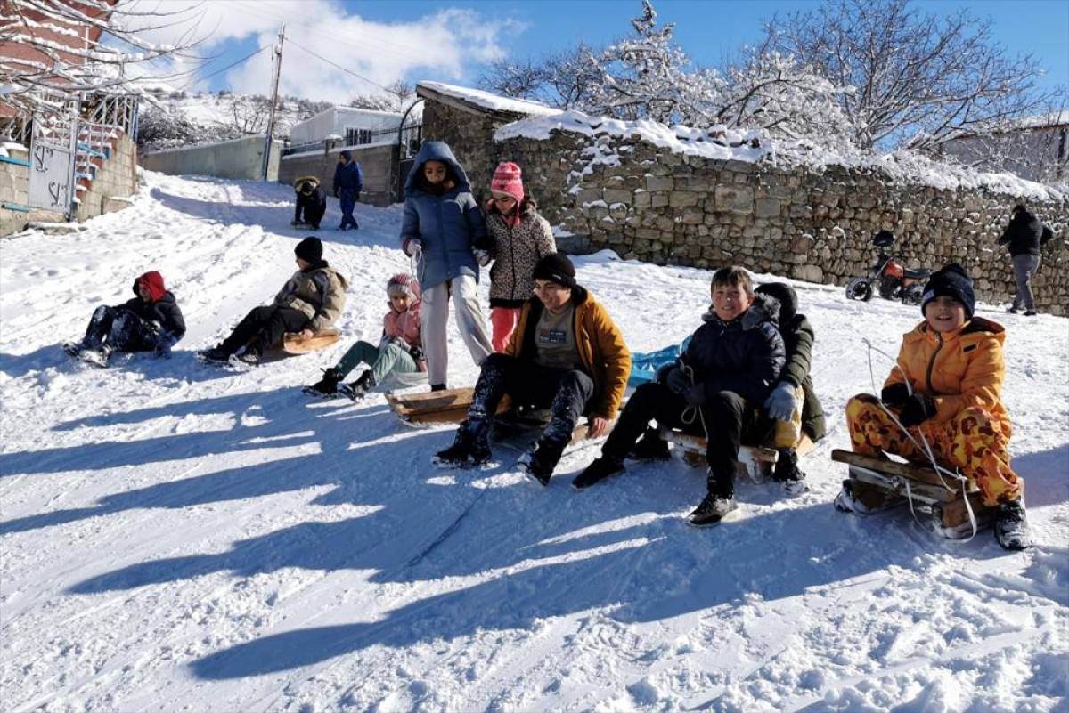 Kar kalınlığının 8 santimetreye kadar ulaştığı ilçede, bir araya gelen çocuklar kızak ve poşetlerle karlı yokuşların yolunu tutuyor.