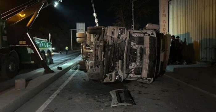 Eyüpsultan'da devrilen hafriyat kamyonunun sürücüsü yaralandı