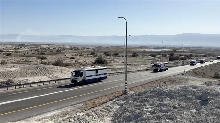 İsrail'in güneyindeki Ketziot Hapishanesi'nde tutulan aktivistleri taşıyan cezaevi nakil araçları, sınır kapısına doğru geçiş yaptı.