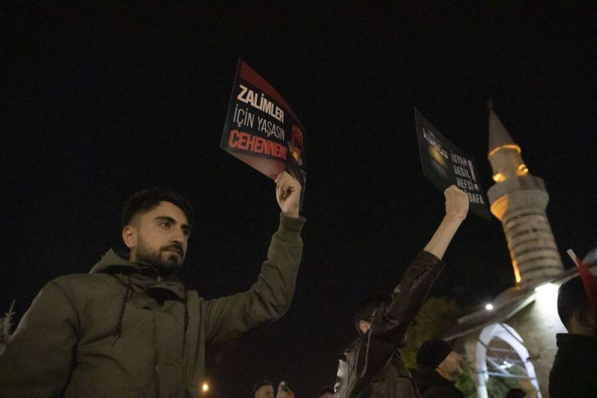 Katılımcılar, Türk ve Filistin bayrakları sallayıp tekbirler getirerek, "Kahrolsun İsrail", "Filistin'e selam", "Katil İsrail" sloganları attı.