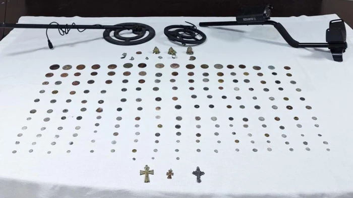 Kınık'ta belirlenen adrese baskın düzenleyen ekipler, Roma, Helenistik ve Bizans dönemine ait olduğu değerlendirilen 190 sikke, 10 obje, 3 demir haç ve metal arama dedektörü ele geçirdi.