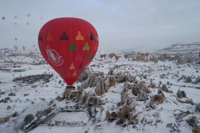 NEVŞEHİR (AA) - Türkiye'nin dört mevsim tatil rotalarından Kapadokya'daki sıcak hava balonları, peribacalarıyla kaplı vadi manzarasına renk kattı.