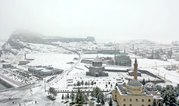 Beyaza bürünen Kars Kalesi ve şehir merkezindeki tarihi yapılar güzel görüntü oluşturdu.