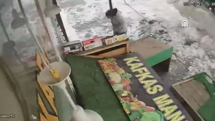 KARS (AA) - Kars'ta bir çocuğun 5 katlı apartmanın çatısından düşen kar ve buz kütlesinin altında kalmaktan son anda kurtulması, güvenlik kamerasına yansıdı.