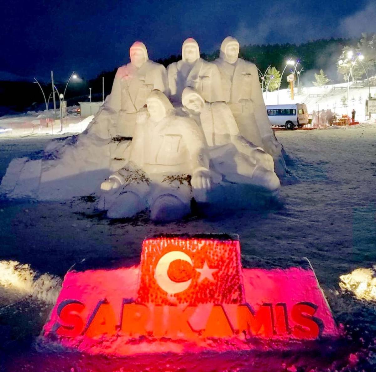 KARS (AA) - Kars'ta, Sarıkamış Harekatı'nda şehit düşen askerler anısına temsili olarak yapılan kardan heykeller ışıklandırıldı.