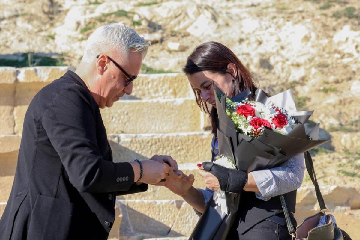 Gültekin, geçmişi yaklaşık 2 bin yıl öncesine dayanan Pompeiopolis Antik Kenti’ndeki tiyatroda, hayatını birleştirmek istediği Arzu Yüksel’e evlilik teklif etti.
