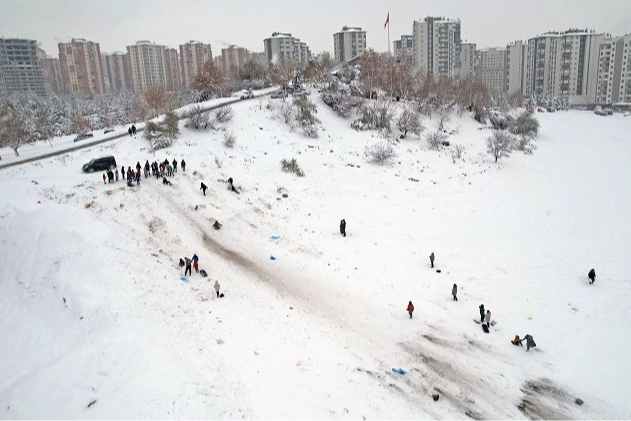 Her yaştan insanın akın ettiği alanda, eline geçirdikleri tüm malzemelerle tepeden aşağıya kayan çocuklarla birlikte büyükler de eğlencenin keyfini çıkardı.