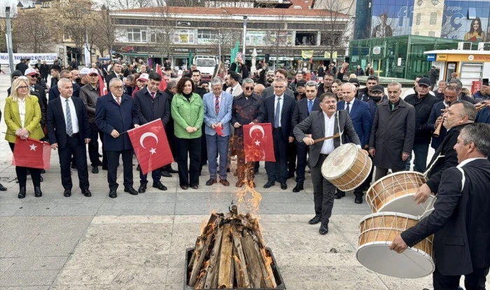 İl Kültür ve Turizm Müdürlüğünce Cacabey Meydanı'nda düzenlenen etkinlikte, il protokolü nevruz ateşini yakarak, örste demir dövdü.