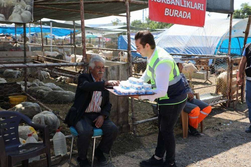 Kayseri'nin Talas Belediyesi, kurban pazarında sunduğu imkanlara, sıcak günlerde vatandaşların serinlemesi için dondurma da ekledi. Kurbanlık hayvan satıcılarına ve kurban almaya gelen vatandaşlara dondurma ve su ikramında bulundu.