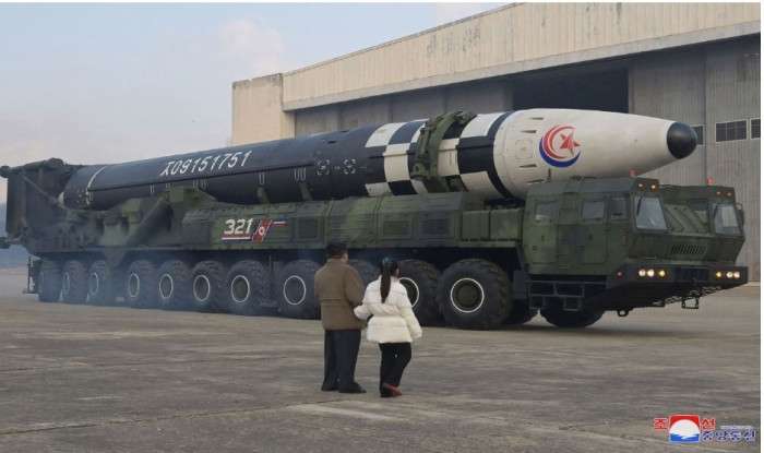 "Hwasong-17" füzesinin fırlatışını gösteren fotoğraflarda Kim'in, elinden tuttuğu 12-13 yaşlarındaki beyaz montlu bir kız çocuğu ile tekerlekli füze platformunun önünde yürüdüğü, piste taşınırken izlediği, dikey konuma getirildikten sonra pistte dolaştığı görülüyor.