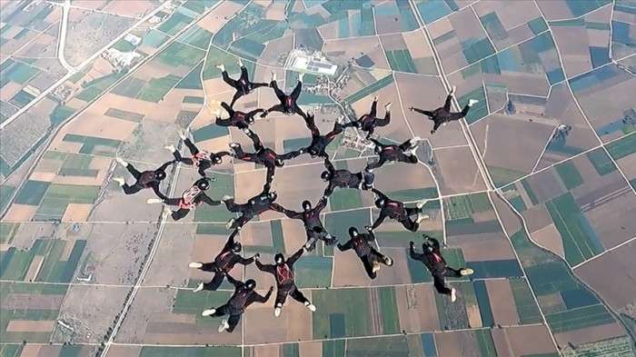 Paylaşımdaki görüntülerde askerlerin uçaktan atlayışı ve gökyüzünde birbirlerine tutundukları anlar yer alıyor.
