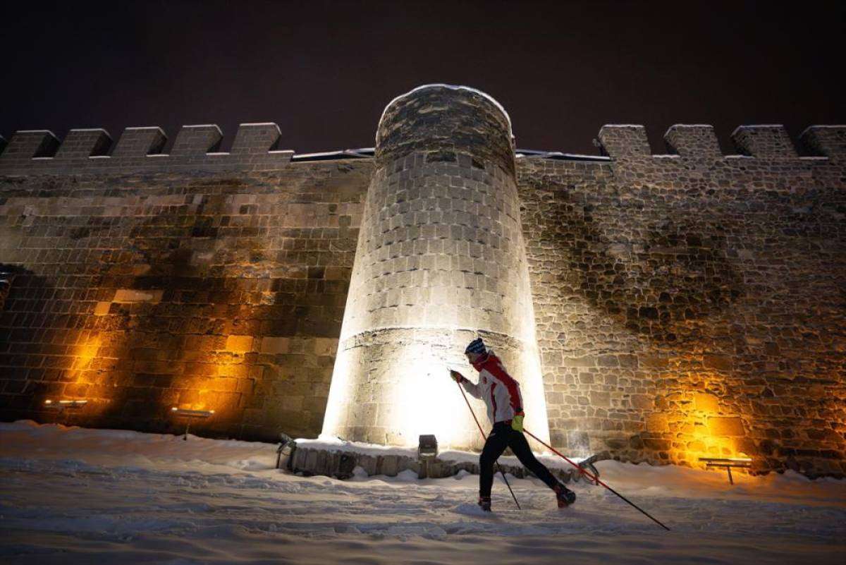 Erzurum Teknik Üniversitesi Spor Bilimleri 3. sınıf öğrencisi Oduncu, hava sıcaklığının sıfırın altında 7 dereceye düştüğü gece saatlerinde kentin tarihi yapılarının bulunduğu sokaklarda kayak yaptı.