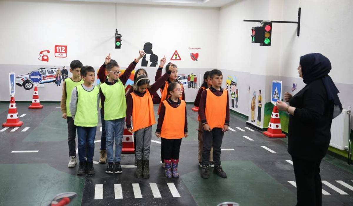 Trafik levhaları, kırmızı ışık, yaya geçidi ve diğer görsel materyallerle donatılan sınıfta, polis ve jandarma trafik ekipleri ile öğretmenler, öğrencilere trafik güvenliği konusunda eğitim veriyor.