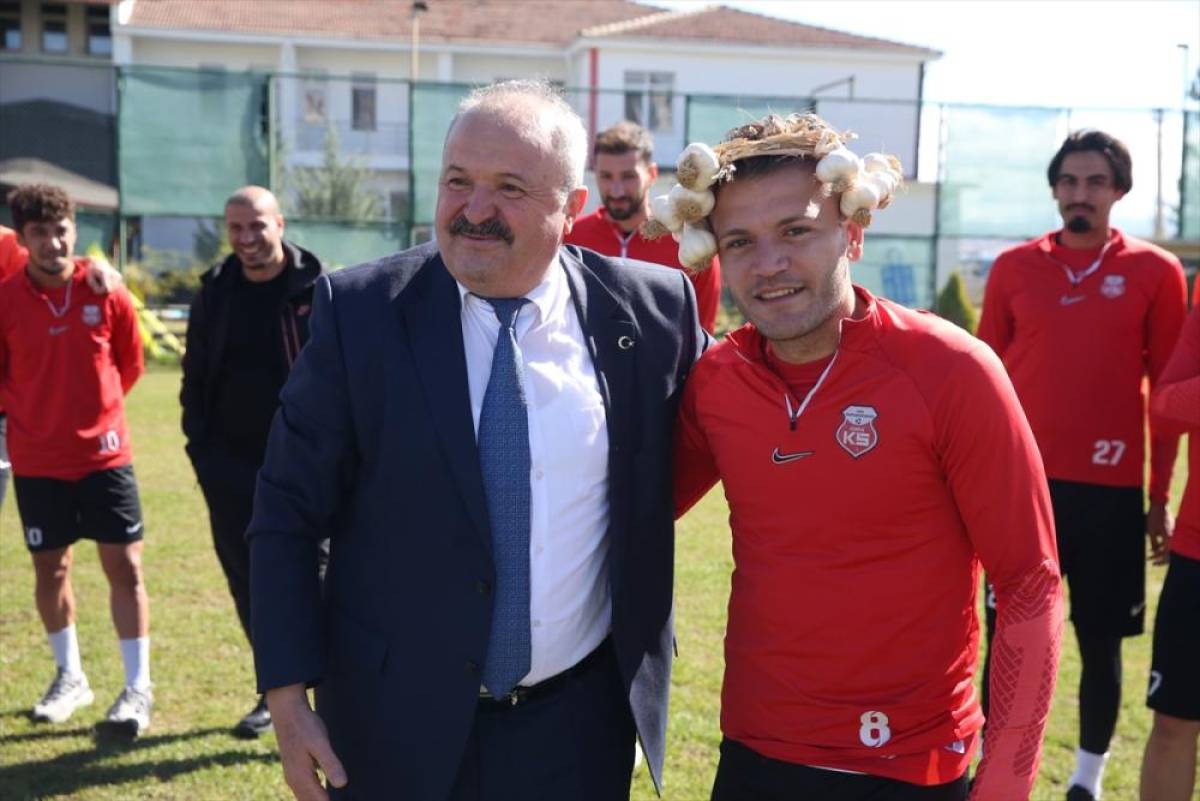 Hafta sonu sahasında oynayacakları İskenderunspor maçı hazırlıklarını sürdüren Kastamonusporlu futbolcularla sohbet eden öğrenciler, sarımsakların saplarından örerek yaptıkları taçları futbolcuların başına taktı.