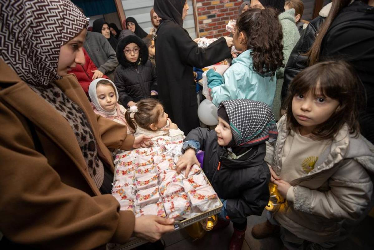 Mehmet Akif Ersoy Caddesi'ndeki dernek binasında velilerinin gözetiminde toplanan çocuklara fener, balon, kaymak gibi çeşitli hediyeler verildi.
