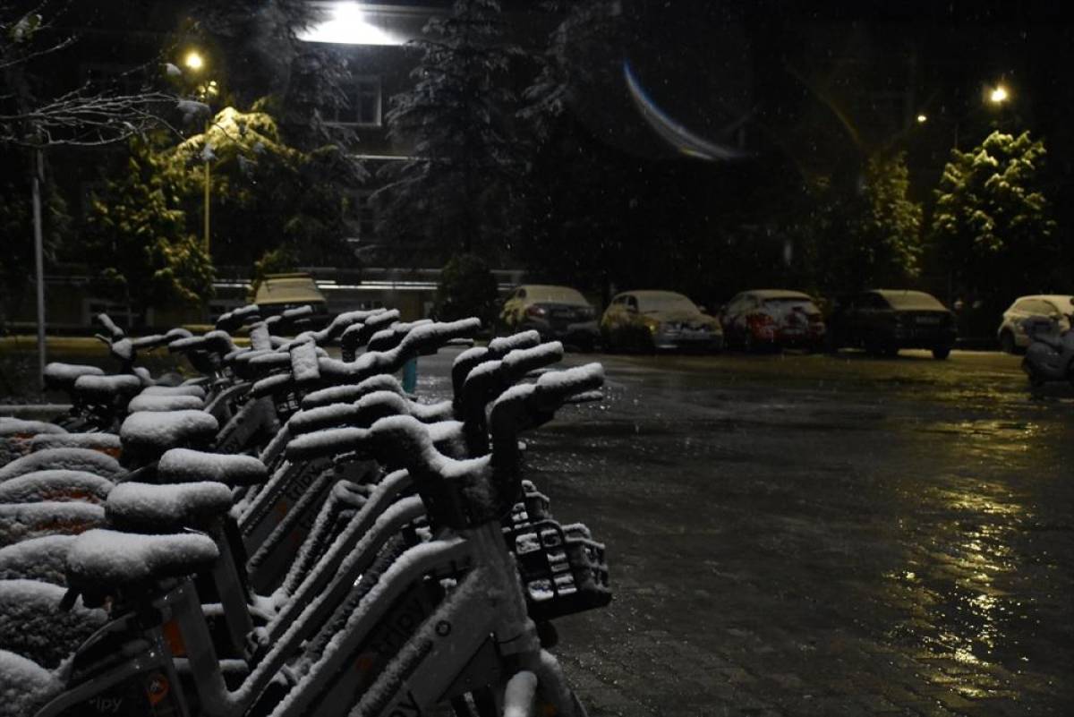 Yağış nedeniyle ağaçlar, banklar, yeşil alanlar ve araçlar üzerinde kar birikintileri oluştu.