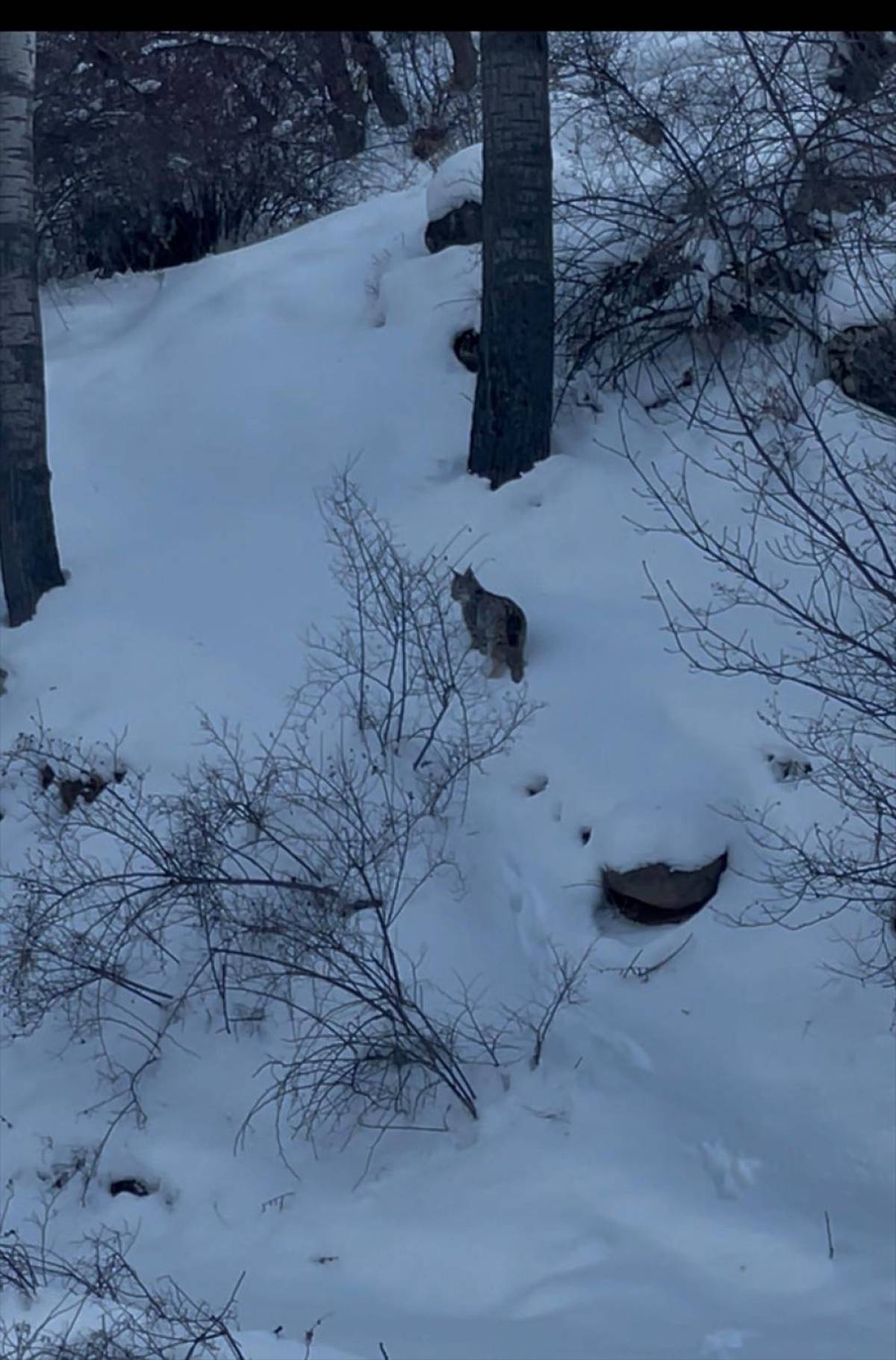 Geminbeli Geçidi Karalar köyü Selimler mezrası yakınlarında karla kaplanan dağlarda yiyecek bulamayan bir vaşak, kara yolu kenarında görüntülendi.