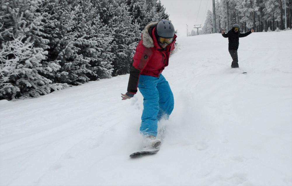 Snowboard tutkunları, Sarıçam ormanlarıyla çevrili kayak merkezinde sezonun ilk kayağını yaptı.