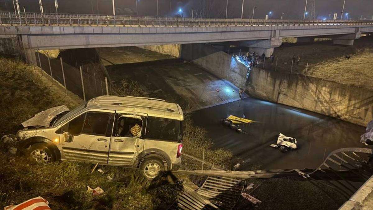 Çarpışmanın etkisiyle bariyerleri aşan iki araçtan kamyon Alibey Deresi'ne düştü, hafif ticari araç ise otluk alanda durdu.