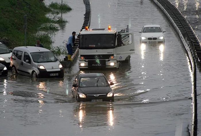 Bu sırada caddede ilerlemeye çalışan bazı araçlar suda mahsur kaldı. İki otomobilin bir kısmı suya gömülürken, araçtakiler de mahsur kaldı.