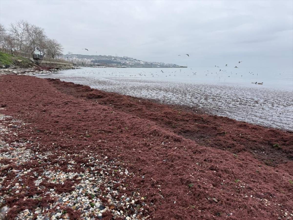 Tekirdağ'da poyraz nedeniyle sahilin bir kısmı kırmızı yosunla kaplandı