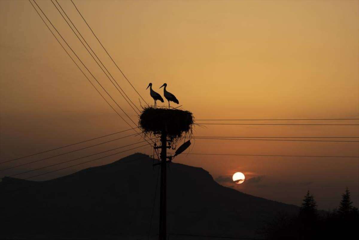 Gündüzleri sulak alanlarda yiyecek arayan leylekler, gün batımında yuvalarına dönerek yırtıcı hayvanların saldırısından korunmaya çalışıyor.