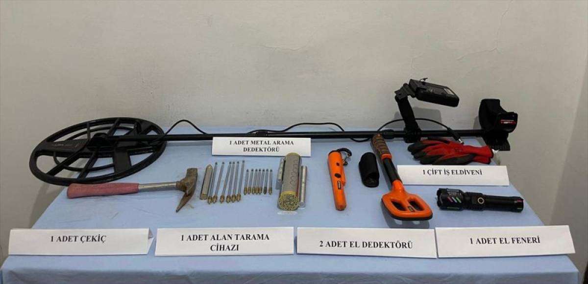 Operasyonda, tarama cihazı, 2 el dedektörü, metal arama dedektörü, çekic, el feneri ve iş eldivenleri ele geçirildi.