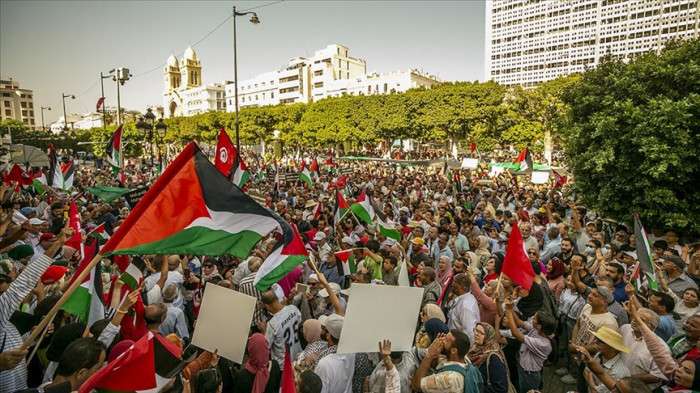 Gençlerin sosyal medya üzerinden yaptığı çağrı üzerine Filistin bayraklarını taşıyan yüzlerce kişi başkent Tunus'un merkezindeki Habib Burgiba Caddesi'nde bulunan Belediye Tiyatrosu önünde toplandı.