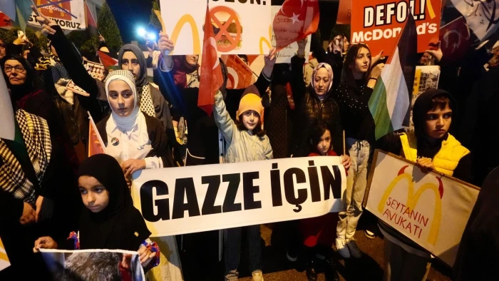 Ellerinde Türk ve Filistin bayrağı ile "Defol McDonald's" yazılı dövizler taşıyan gruptakilere, araçlarıyla yoldan geçen sürücüler de korna çalarak destek verdi.