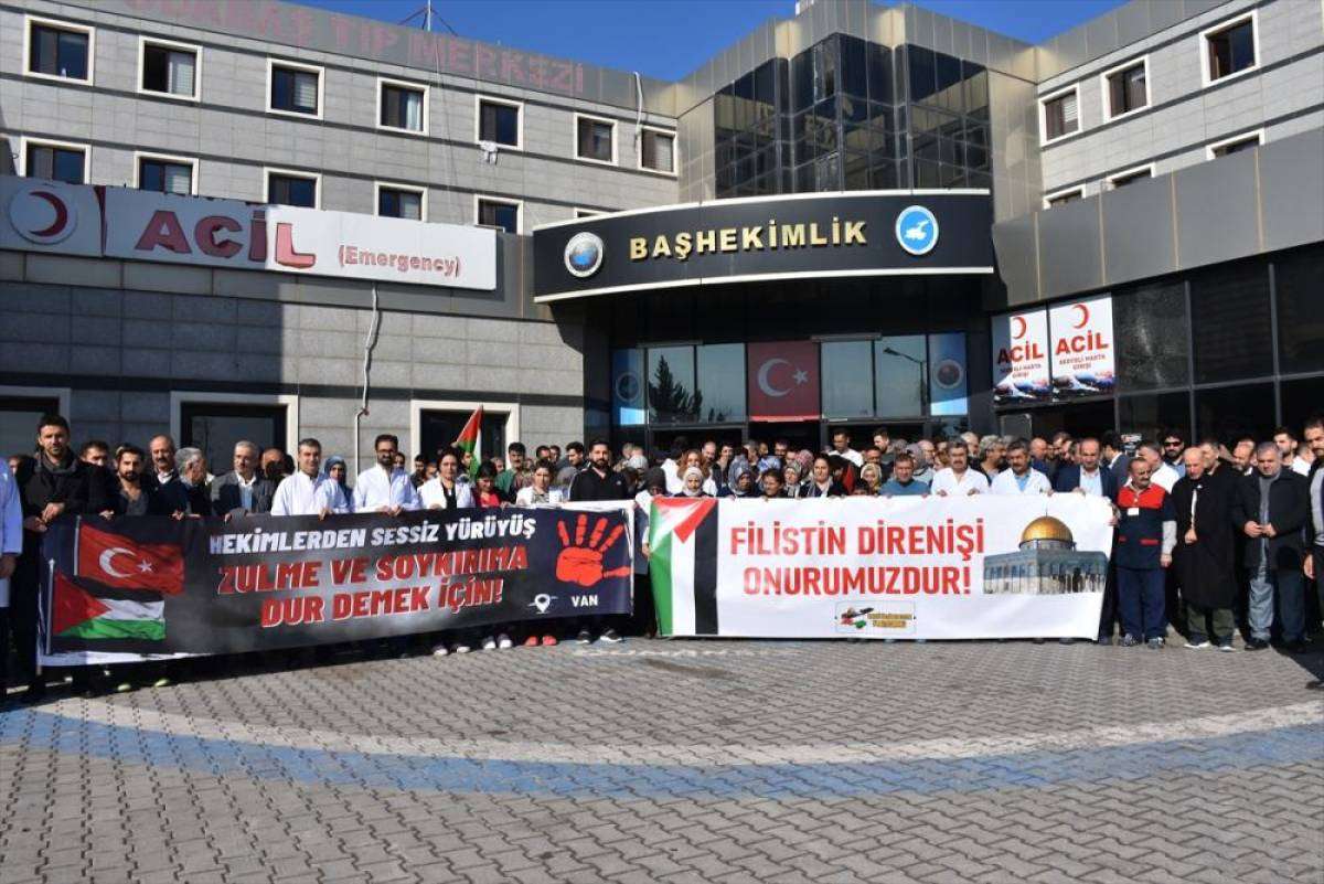 Van Yüzüncü Yıl Üniversitesi (YYÜ) Dursun Odabaş Tıp Merkezi önünde toplanan sağlık çalışanları, Türk ve Filistin bayrakları taşıdı.