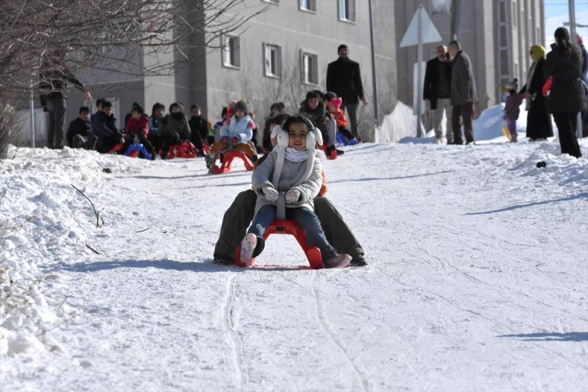 Kızaklarıyla tepeye tırmanan çocuklar, gün boyunca kayarak eğlenceli zaman geçiriyor.