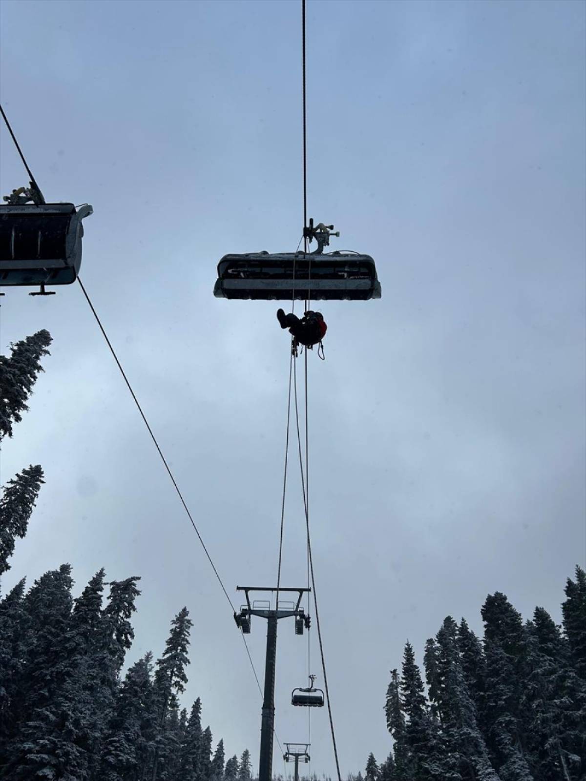 Eğitim kapsamında yapılan tatbikatta ekipler, kurdukları istasyonla telesiyej üzerindeki kabinlere ulaştı.