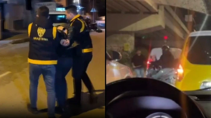 Başka bir sürücünün cep telefonuyla kaydettiği görüntülerde, elinde sopa bulunan taksi sürücüsünün diğer aracın kapısını açmaya çalıştığı, aracın hareket etmesiyle de kendi aracına döndüğü görülüyor.