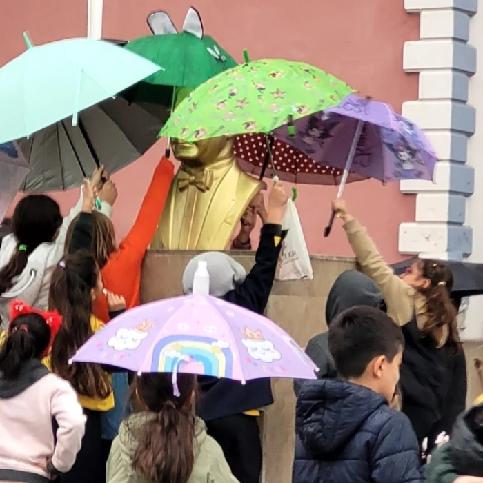 Arkadaşlarının davranışından etkilenen diğer öğrenciler de şemsiyelerini açıp büstü yağmurdan korumaya çalıştı.