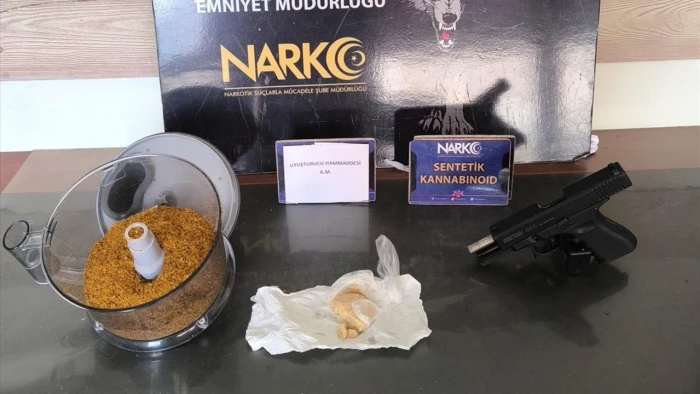 Toprağa gömülü cam şişeleri ve kümesi inceleyen ekipler, toplamda 450,78 gram esrar, 12,58 gram sentetik uyuşturucu, 62 uyuşturucu etkili hap, 0,86 gram kokain, 1 kök Hint keneviri, hassas terazi ve ruhsatsız tabanca ele geçirdi.