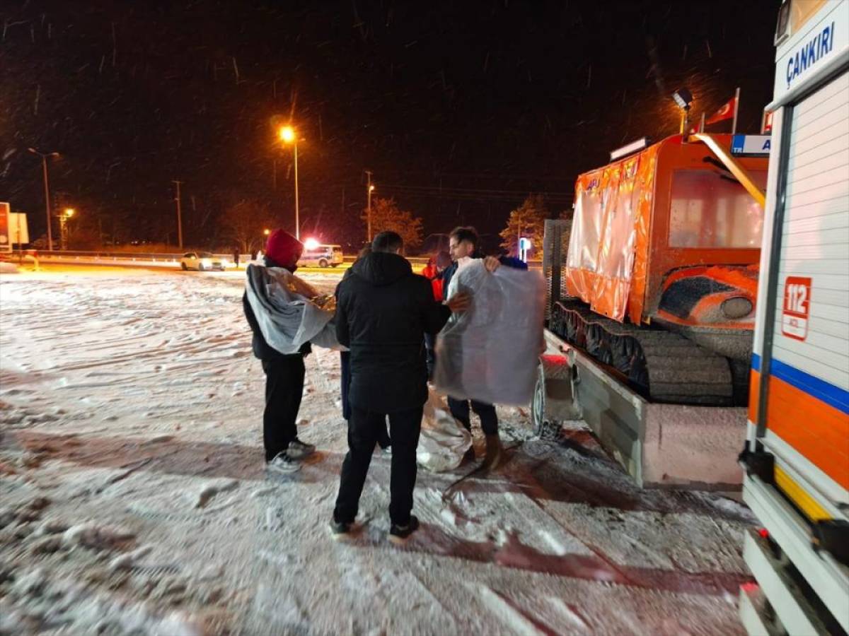 " AFAD tarafından 178 personel ve 47 araç, Türk Kızılay tarafından ise 16 personel ve 4 araç, Bolu-Gerede, Karabük ve Çankırı-Çerkeş'te sahada görev yapmaktadır. Yolda mahsur kalan vatandaşlarımıza 782 kumanya ve 600 battaniye yardımı yapılmıştır. Vatandaşlarımızın, başta buzlanma ve don olayına bağlı ulaşımda aksamalar ile yerde kar örtüsü olan yüksek ve eğimli alanlarda çığ riski gibi olumsuzluklara karşı dikkatli ve tedbirli olmalarını, yetkili mercilerin uyarılarını dikkate almalarını önemle hatırlatıyoruz. Gelişmeler takip edilmektedir."