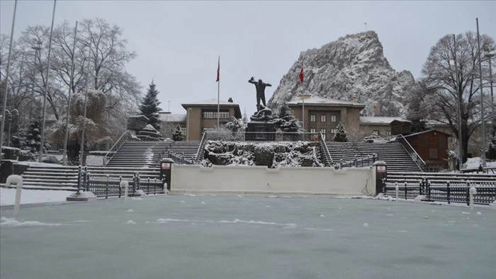 Kar yağışıyla birlikte beyaza bürünen Zafer Meydanı'ndan geçenler yağan karın keyfini yaşadı.