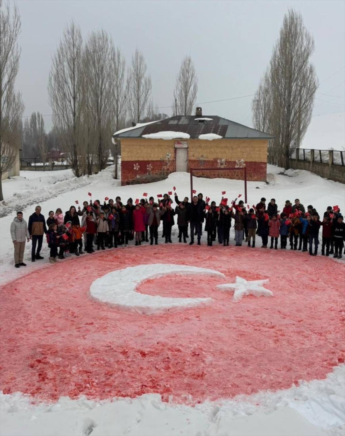 AĞRI (AA) - Ağrı’nın Taşlıçay ilçesindeki köy okulunda öğrenciler, boyalarla karın üzerine Türk bayrağı yaptı.