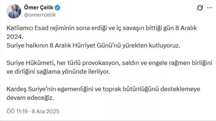 ANKARA (AA) - AK Parti Genel Başkan Yardımcısı ve Dış İlişkiler Başkanı Zafer Sırakaya, Suriye halkının 8 Aralık Hürriyet Günü'nü kutladı.