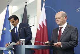 Scholz, Almanya ve Katar arasındaki diplomatik ilişkilerin 50. yıl dönümü vesilesiyle Berlin'e gelen Şeyh Temim'i Başbakanlık binasının önünde karşıladı.